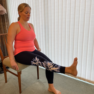 Lift your right leg out straight in front of you at the height of your chair, engage your quadriceps to keep your leg as straight as possible as you do little circles with your ankle 10x in one direction and then 10x in the opposite direction.